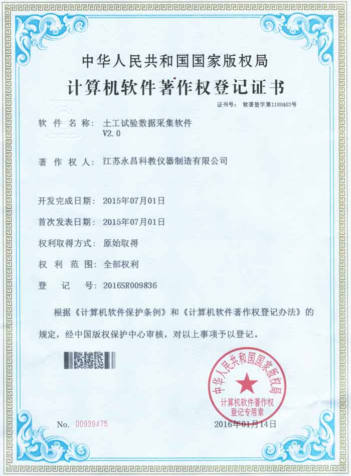 我公司土工試驗數據采集軟件V2.0通過中國版權保護中心審核,獲得中華人民共和國國家版權局版發的計算機軟件著作權登記證書。